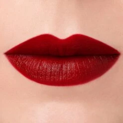 Semi-matte blood red lipstick.